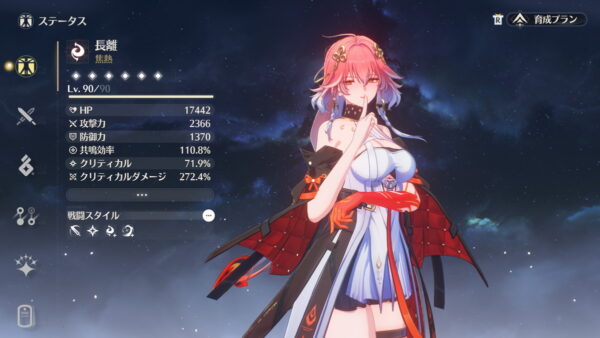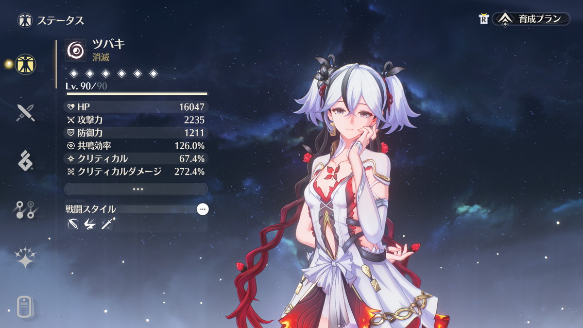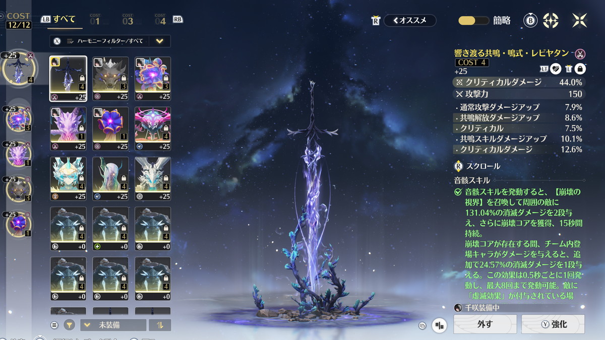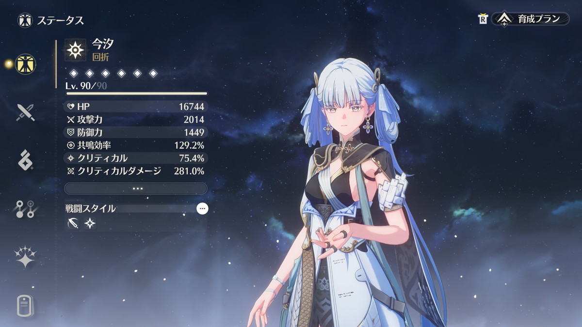 欠点として共鳴開放を毎ローテ発動するため無凸では共鳴効率を40%以上確保する必要があって音骸厳選がベリーハードです。クリ率/クリダメ/共鳴効率で揃えるのはかなり大変ですし、沼ると貴重な育成リソースをゴッソリと持っていかれるので、軽い気持ちで選ぶのはオススメしません。