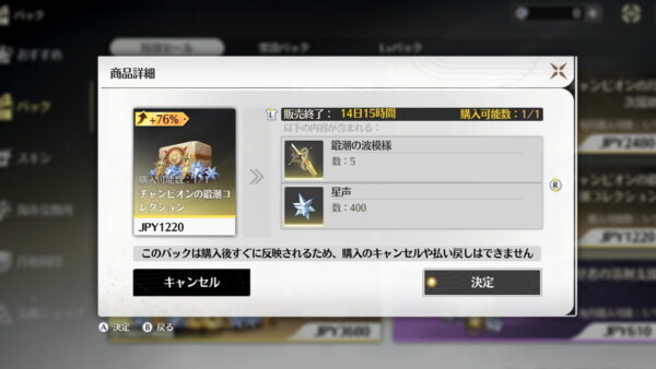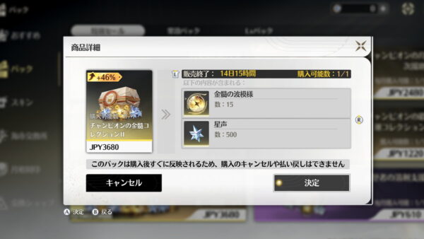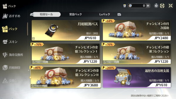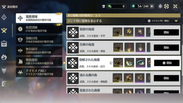 初心者にとって育成の壁があるとしたらここだと思います。一応、週ボス素材が入った課金パックが売り出されることもありますが、バージョン更新時に不定期開催です。