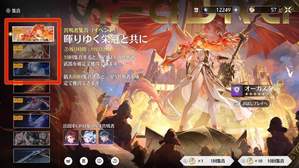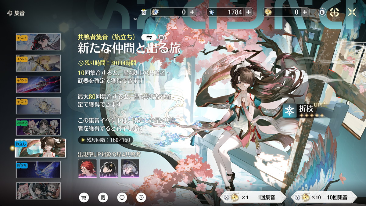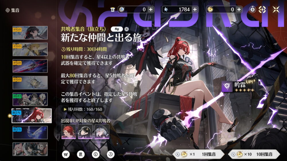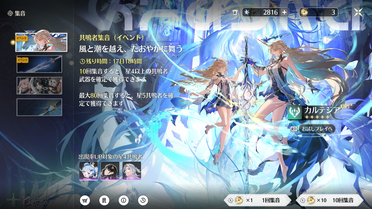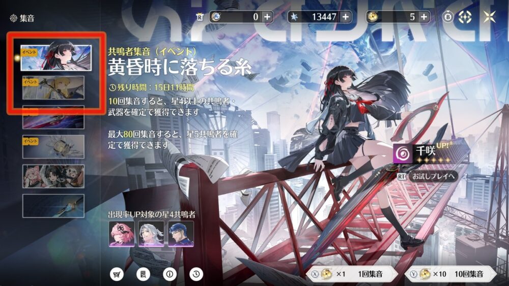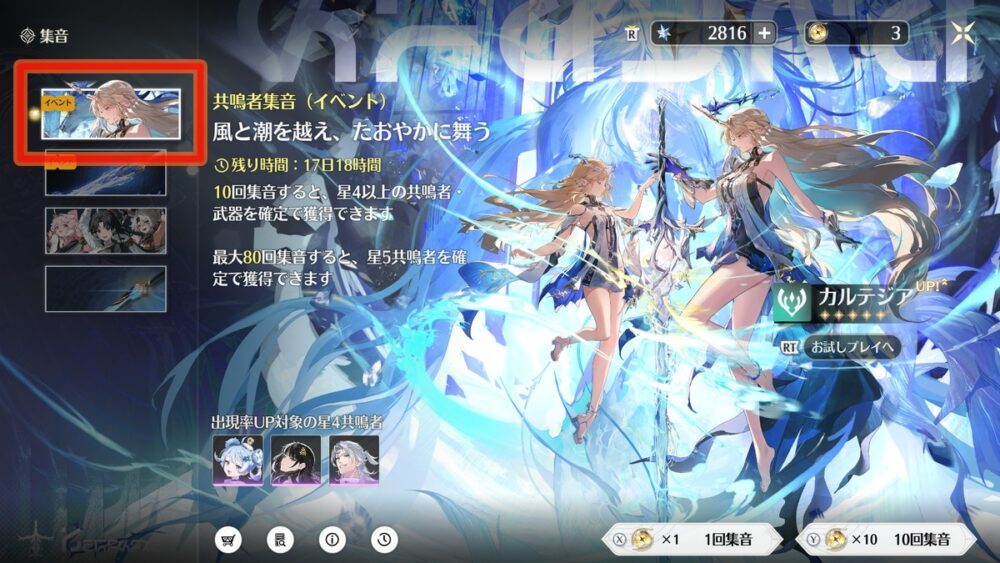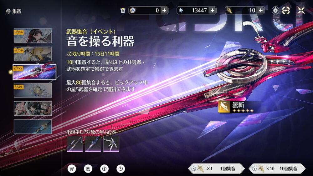 期間限定でピックアップされた限定星5キャラを入手できる限定キャラガチャ「共鳴者集音(イベント)」、そのキャラに性能面でも最適化されたモチーフ武器がピックアップされる限定武器ガチャ「武器集音(イベント)」の2種類があります。