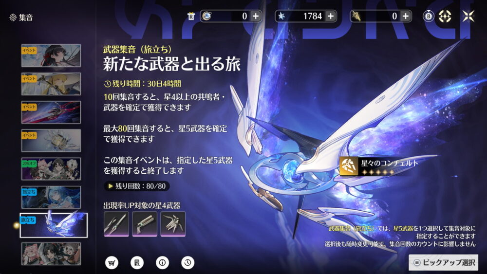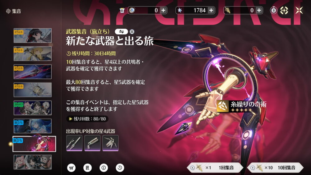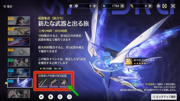 星4ピックアップは確率アップだけで天井がないので必ず引けるわけではありませんが、メインアタッカー用の限定星5武器のオマケで引けるとかなり嬉しい武器です。