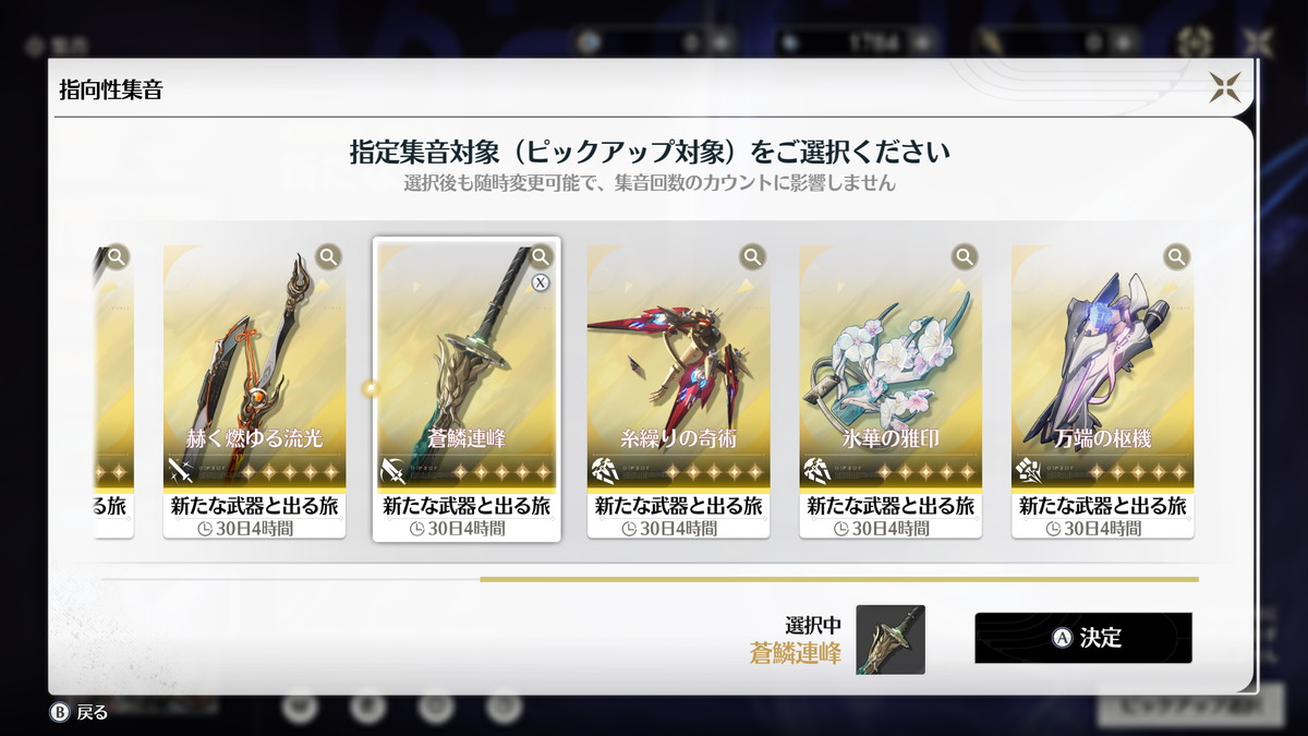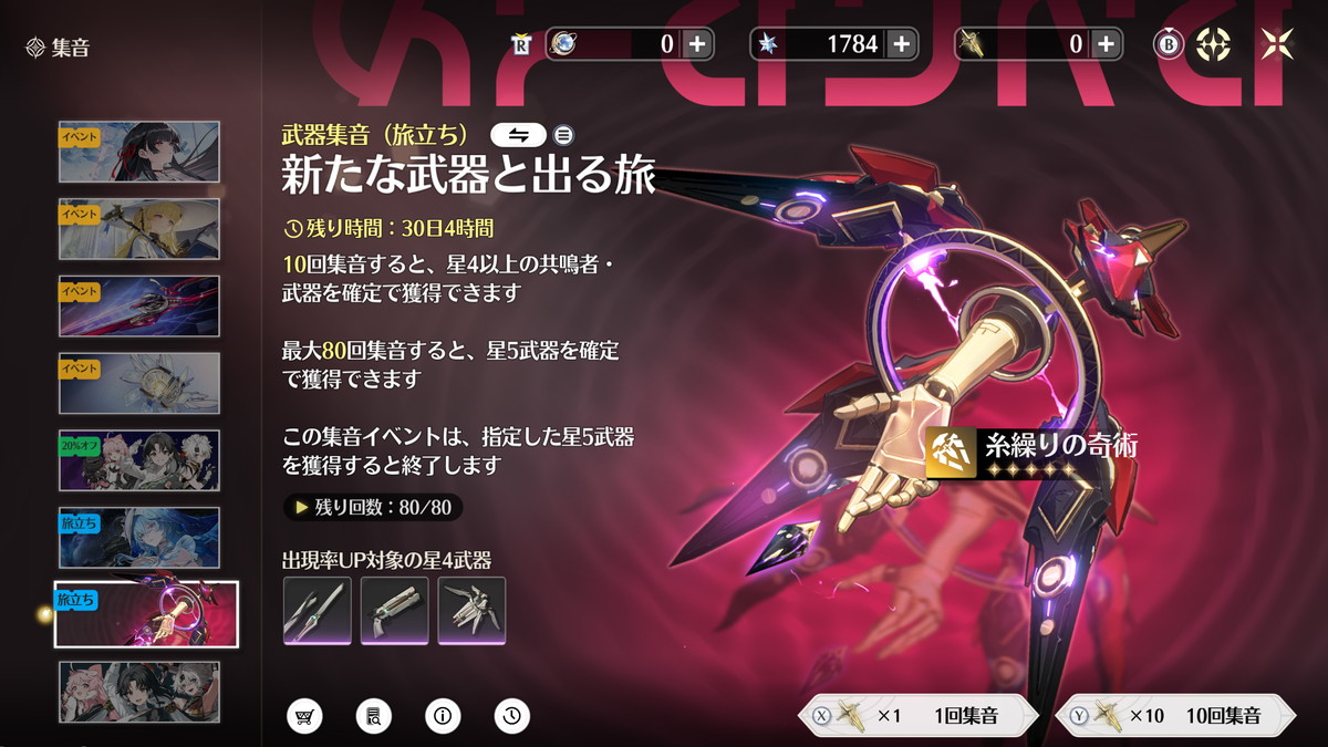 武器ガチャについて1つ例外として、恒常星5のアンコを強く使いたい人は吟霖のモチーフ武器「糸繰りの奇術」を引いておくのがオススメです。
