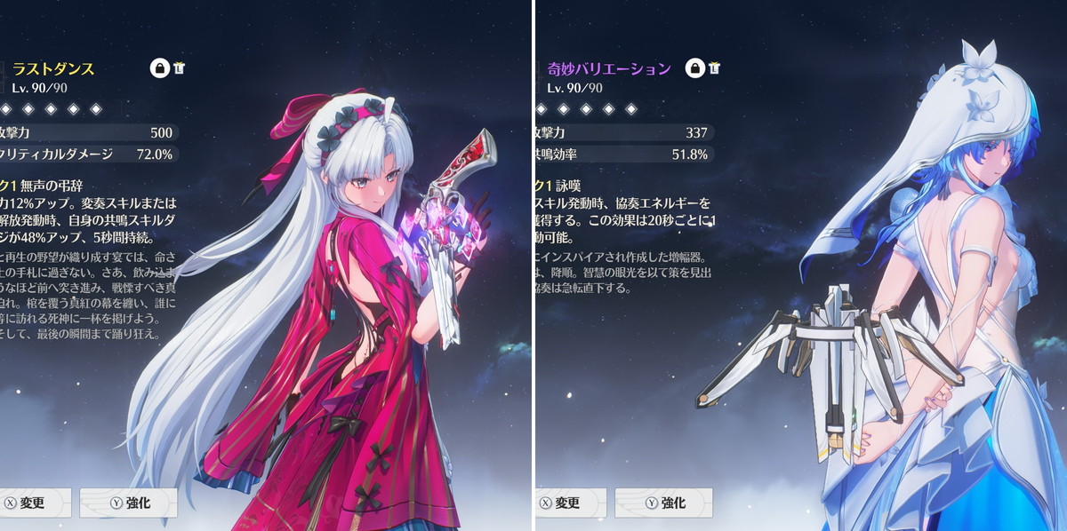 もちろん理想は『率ダメを5カ所、必要な共鳴効率、さらに攻撃%など有効ステ』を全て揃えることですが、サブオプ開放の育成リソースであるチュナはすぐに枯渇してしまうので、逆境深塔や廃墟に対応できる水準に達したら早めに妥協して育成リソースを温存するのがオススメです。