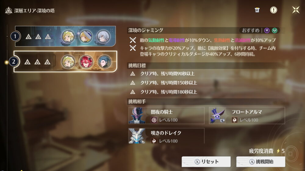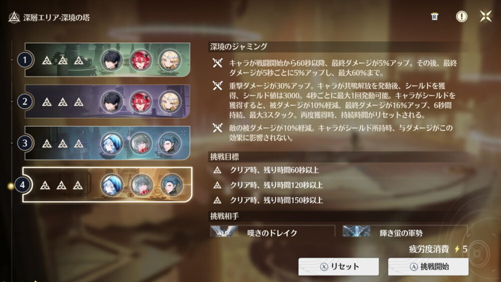鳴潮では同じ属性の敵に対してダメージが減るのと、高難度コンテンツの時限バフ・デバフ以外に有利不利に大きく影響するギミック性はありません。なので、戦力的に言えば無凸の星5キャラが5~6体も揃えば高難度エンドコンテンツは一通りクリアできます。