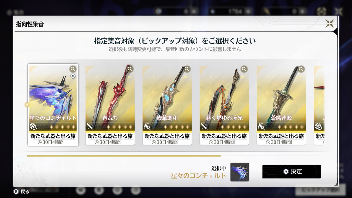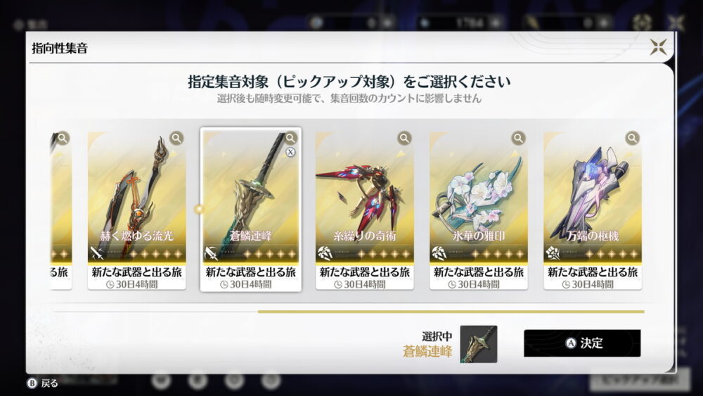 メインアタッカーには同時実装のモチーフ武器があった方が良いですが、サブアタッカー・サポーターは恒常星5武器やバージョンパス星4武器で十分です。