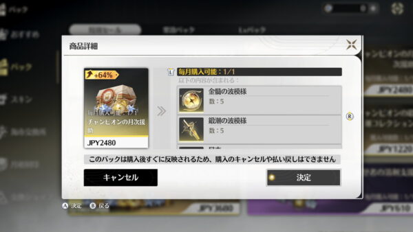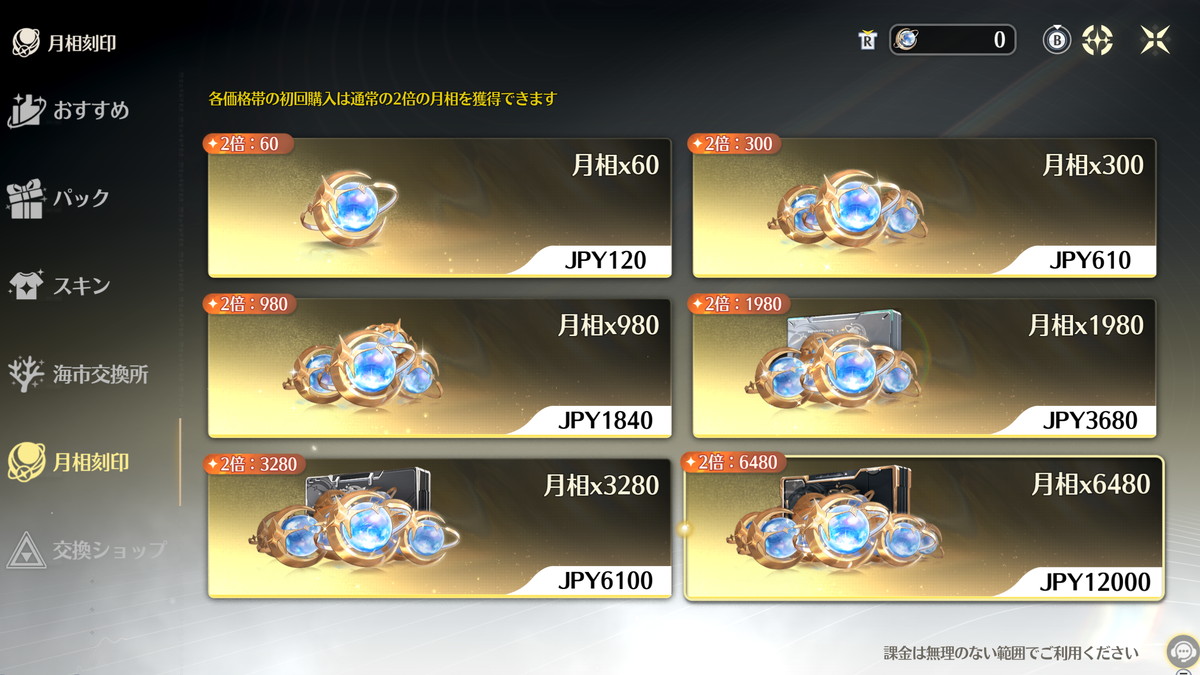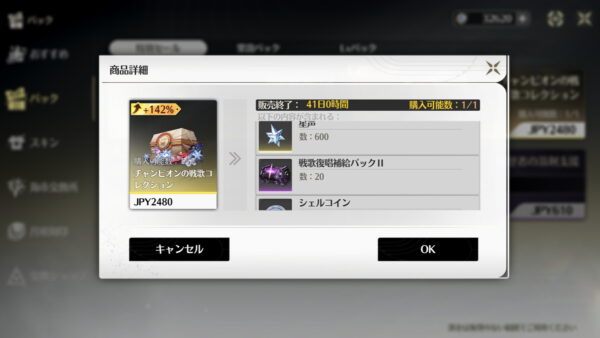 初回はガチャ石 2倍購入が可能なので、予算が許すなら参入直後は2倍購入分は買い切ってガチャを引いた方が最初から限定星5キャラを使えてより楽しめると思います。ちなみに2倍購入は5月の周年イベント毎にリセットされます。