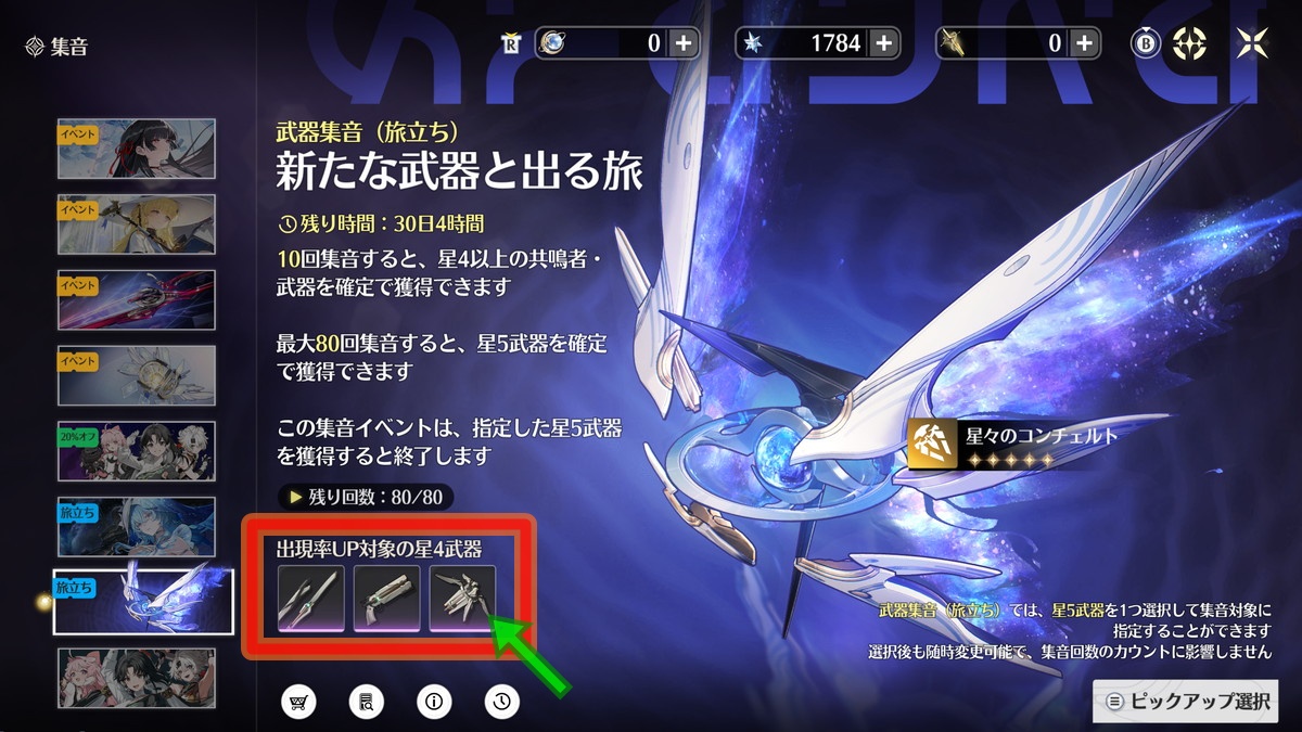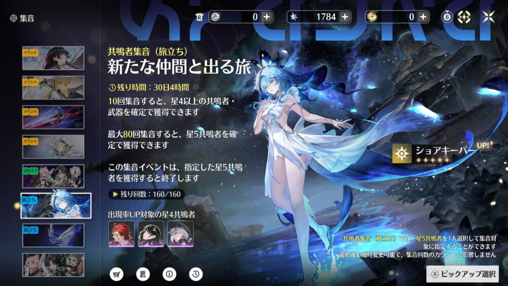 ショアキーパーはモチーフ武器なしでも活躍できますが、旅立ちガチャの限定武器ガチャには星4武器として「奇妙バリエーション」がピックアップされています。