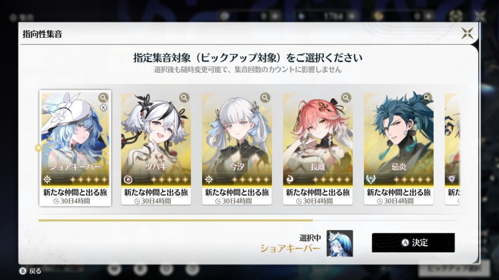「今汐」は同じ旅立ち集音のピックアップなので無理ですし、直近で復刻予定がある、もしくは今後復刻されれば確定で「カルロッタ」を引くという感じでなければ、選ばない方が良いです。