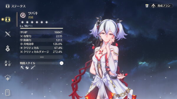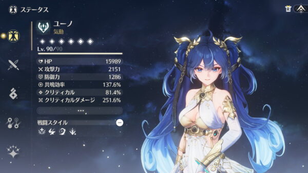チーム全体の全属性ダメージブーストとクリ率&クリダメのバフを持っているので、相性の良いメイン&サブに加える3枠目としてほぼ全てのパーティーで活躍できます。