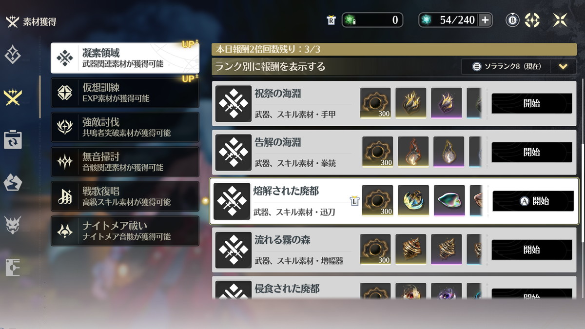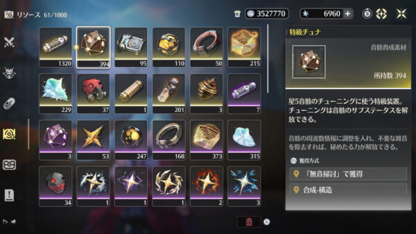 スタミナの使い方としては週ボス素材を確保したら、後は音骸厳選のためにチュナ(サブステ開放素材)とレコード(音骸経験値素材)を漁る感じです。