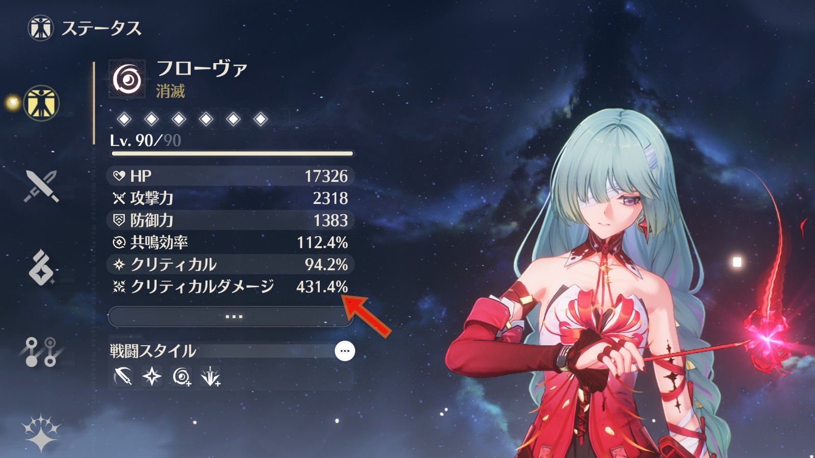 例えば千咲の場合、モチーフ武器を組み合わせるなら武器効果でクリティカル率がアップするのでコスト4音骸のメインステータスはクリティカルダメージを選びます。