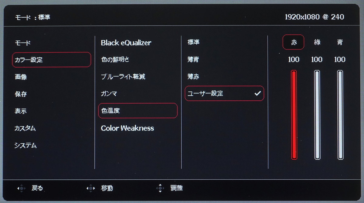 なおアウトボックス時点では(何か管理人が誤操作した可能性もありますが)、ゲーマー1~3のプロファイルが壊れているのか、S.Switchでモードを切り替えると画面表示が崩れました。画面表示が崩れた時は「システム – リセットモード」から現在のモードをリセットすると正常に直ります。