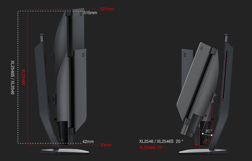 「ZOWIE XL2546K」では従来製品よりも可動域を広めた付属モニタスタンドの調整機能も大きな特徴の1つです。