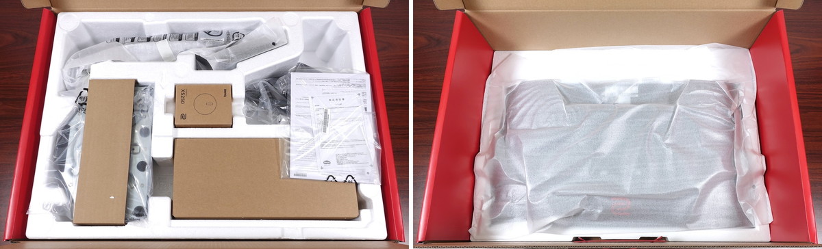 パッケージを開くと液晶モニタ本体や付属品が収められた発泡スチロール製のスペーサーが現れます。スペーサーは2段になっており、上の段にはモニタスタンドやケーブルなどの付属品が、下の段には液晶モニタ本体が収められています。