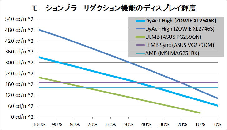 しかしながら「ZOWIE XL2546K」のDyAc+は機能を有効にしても、同機能によって輝度が固定されず、標準動作と同様に0~100%で任意に輝度を調整でき、高設定とプレミアム設定の両方で最大330cd/m^2と非常に明るい画面表示が可能です。